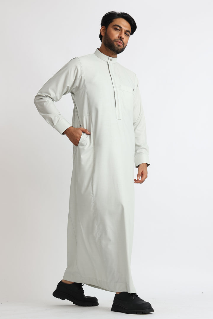 Every detail has been thoughtfully designed, featuring a Single Silver Diamante Button on the top collar and cuffs for a subtle yet striking touch of luxury. The Mystic Thobe offers both style and practicality, with a smart chest pocket on the left and two discreet side pockets. A finely tailored front pleat adds a classic, structured finish.
