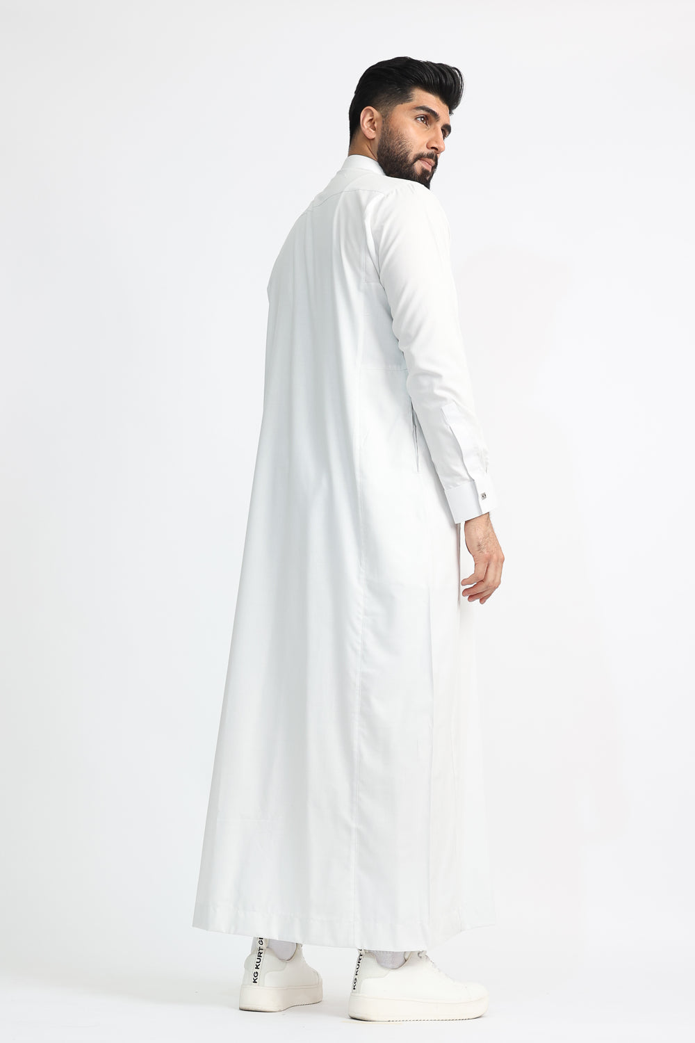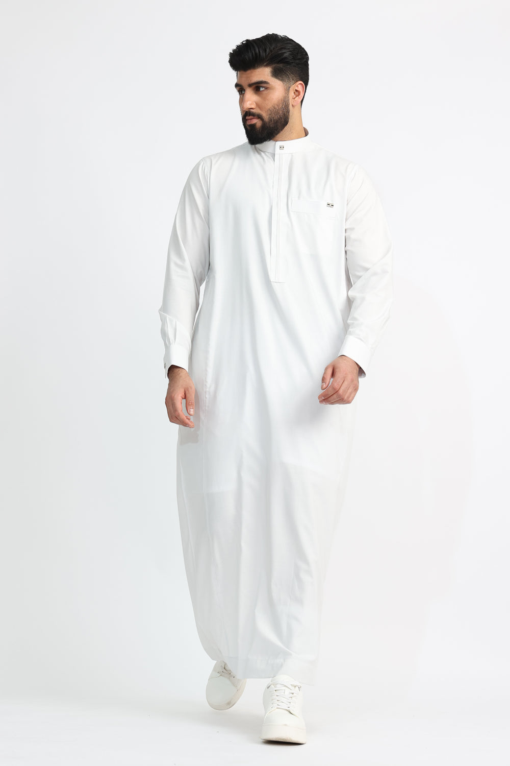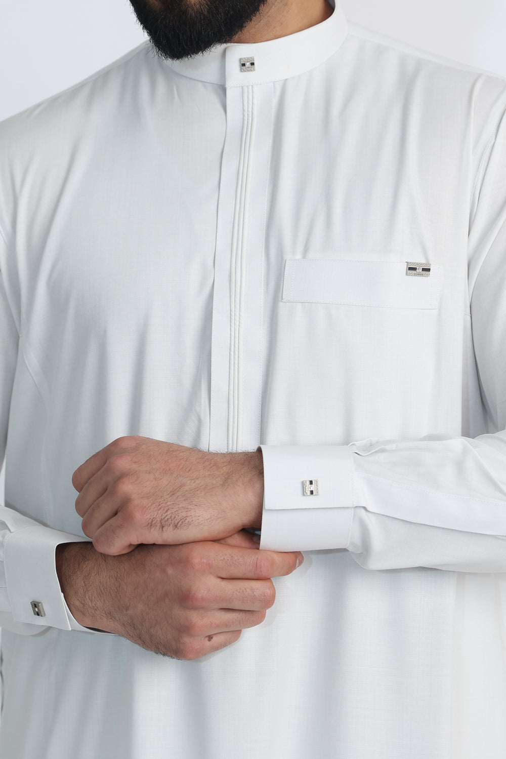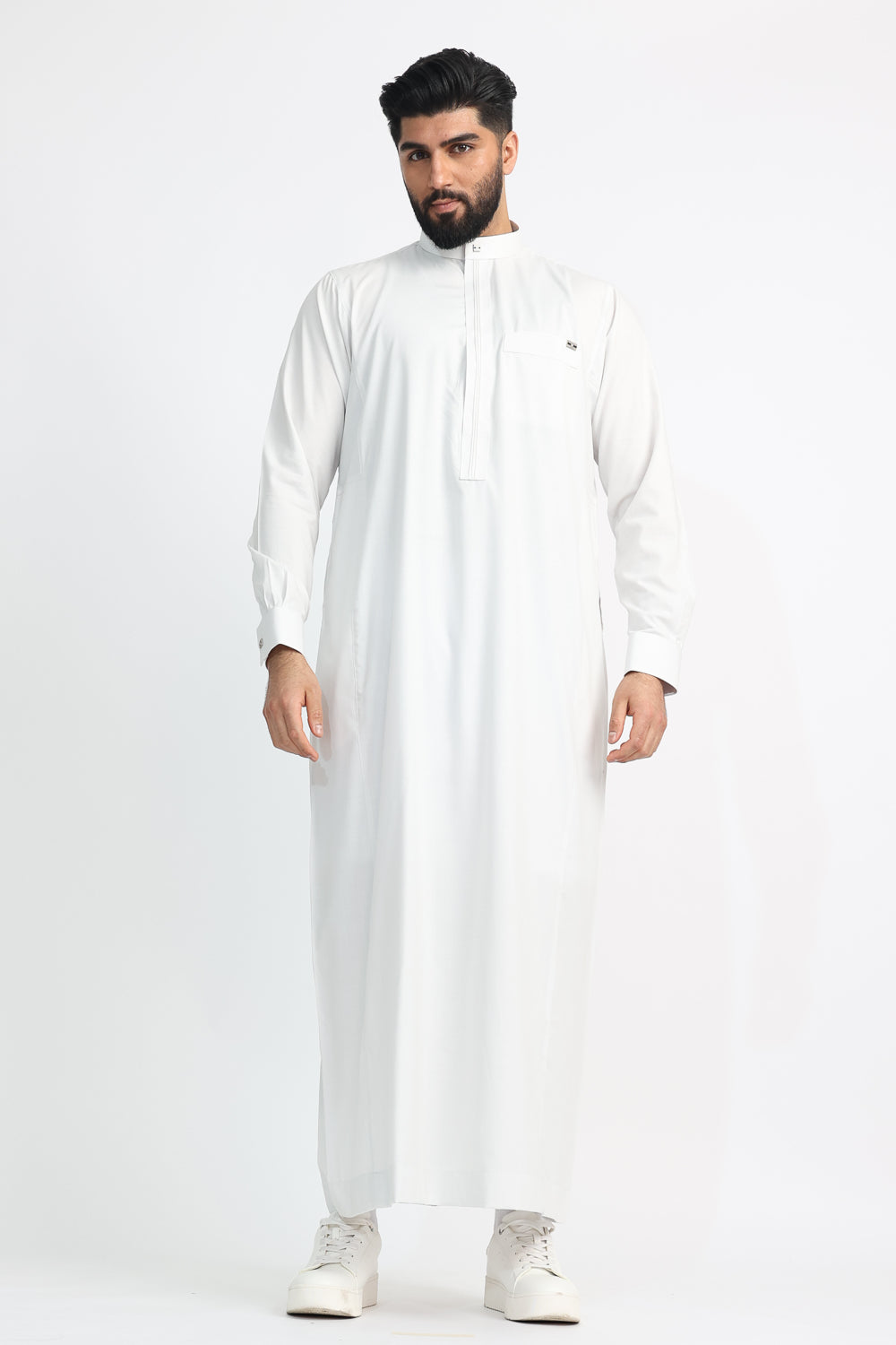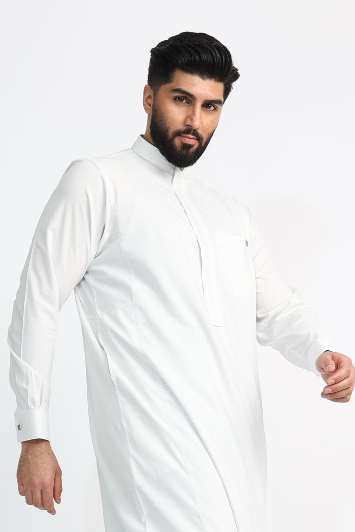 Every detail has been thoughtfully designed, featuring a Single Silver Diamante Button on the top collar and cuffs for a subtle yet striking touch of luxury. The White Smoke Thobe offers both style and practicality, with a smart chest pocket on the left and two discreet side pockets. A finely tailored front pleat adds a classic, structured finish.