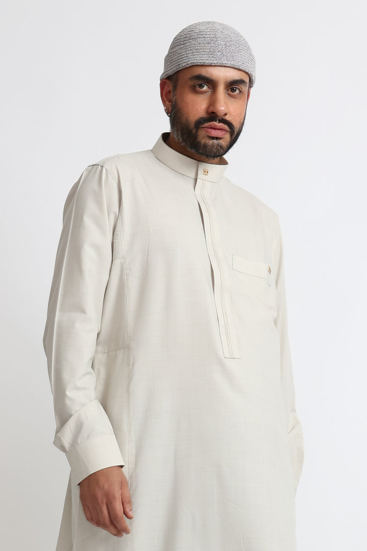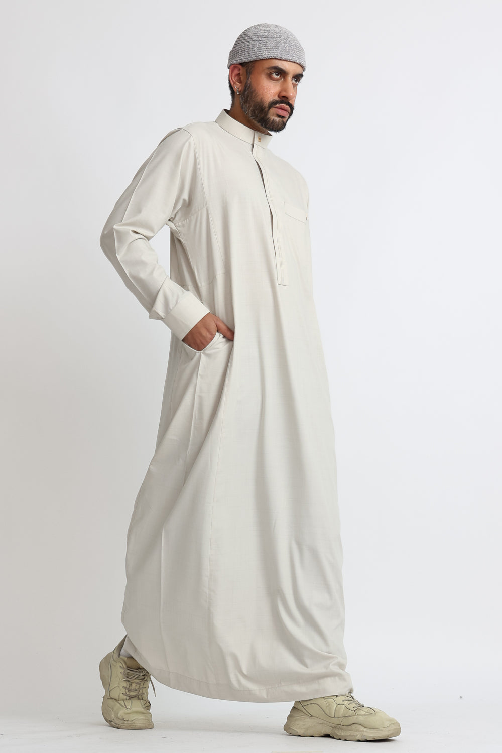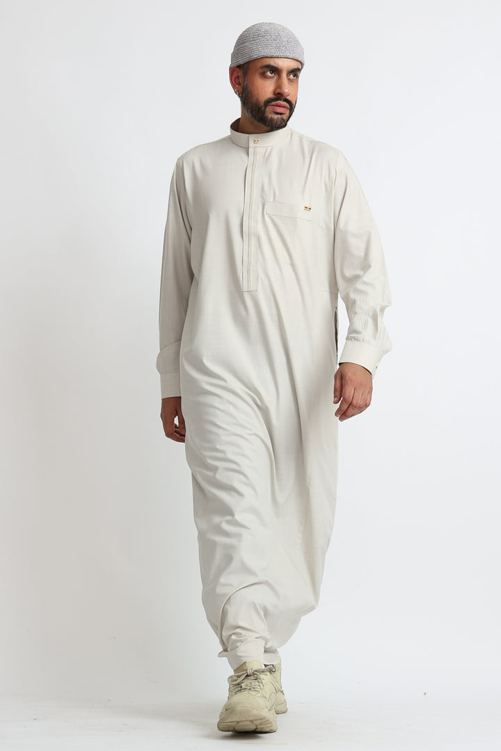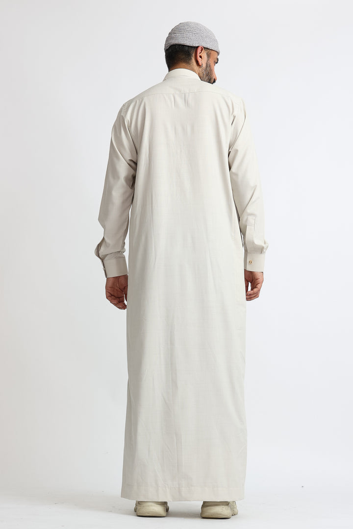 Every detail has been thoughtfully designed, featuring a Single Gold Diamante Button on the top collar and cuffs for a subtle yet striking touch of luxury. The Wild Sand Thobe offers both style and practicality, with a smart chest pocket on the left and two discreet side pockets. A finely tailored front pleat adds a classic, structured finish.