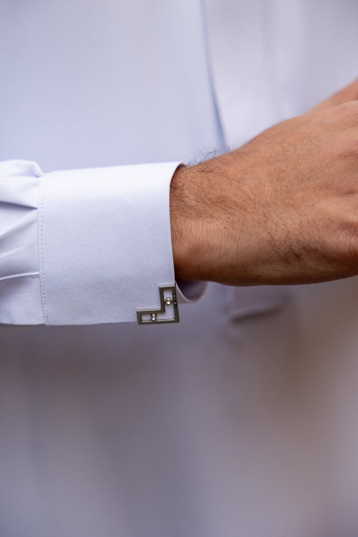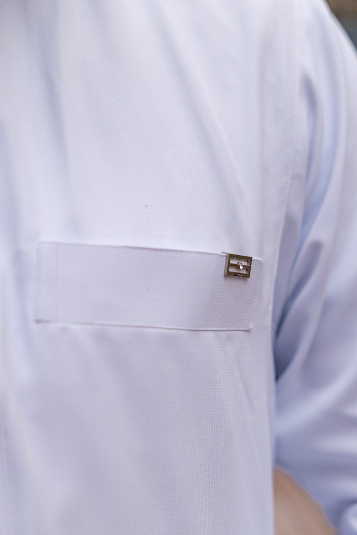 The silver buckle buttons add a touch of elegance to this classic style, while the button square cuff ensures a comfortable fit. The fine print fabric on cuffs and collar further enhances the overall appeal of this thobe.
