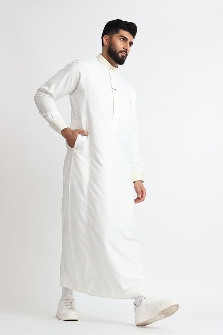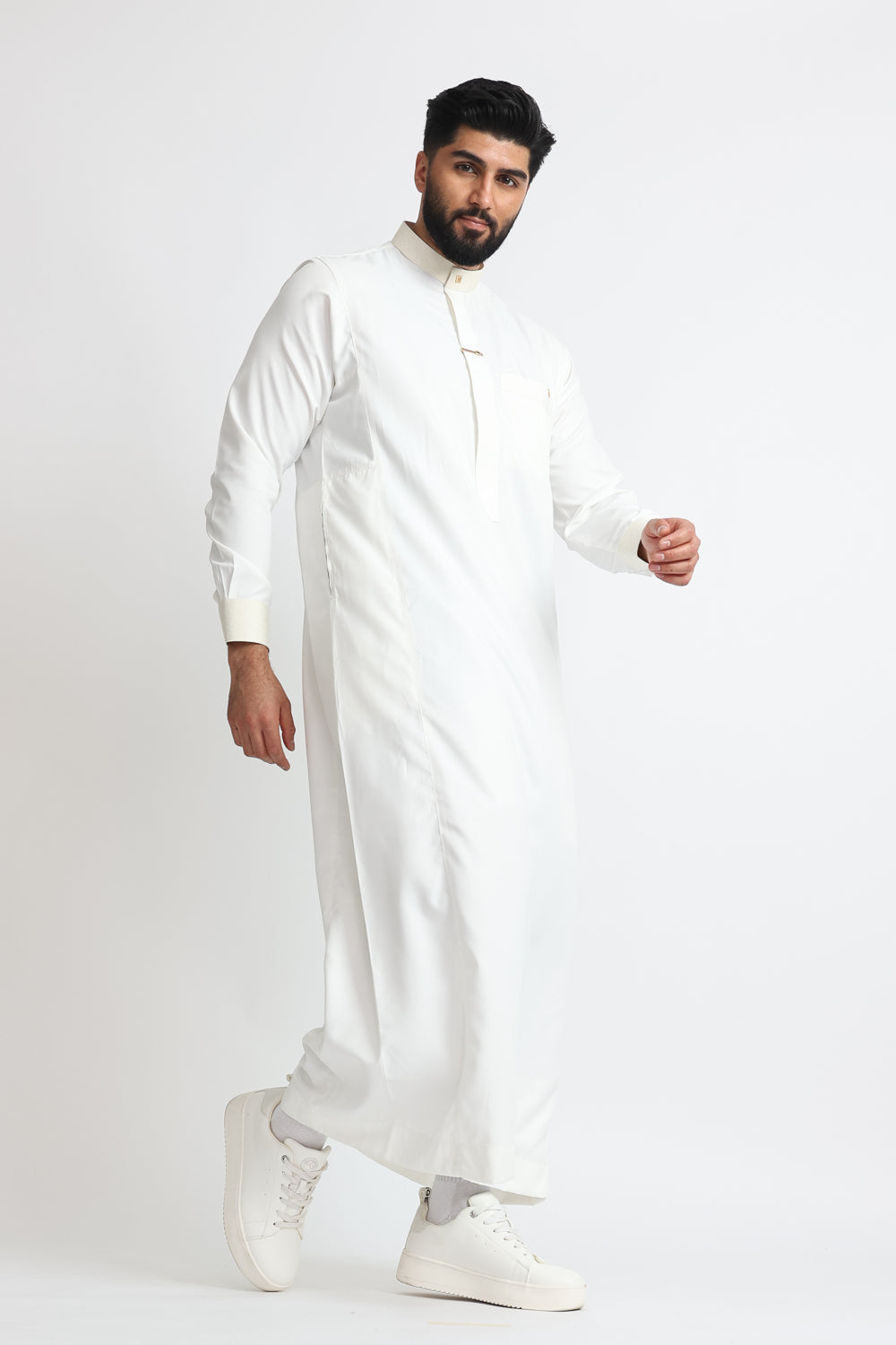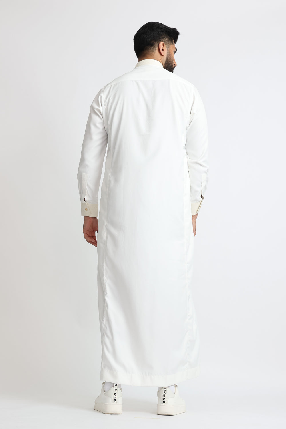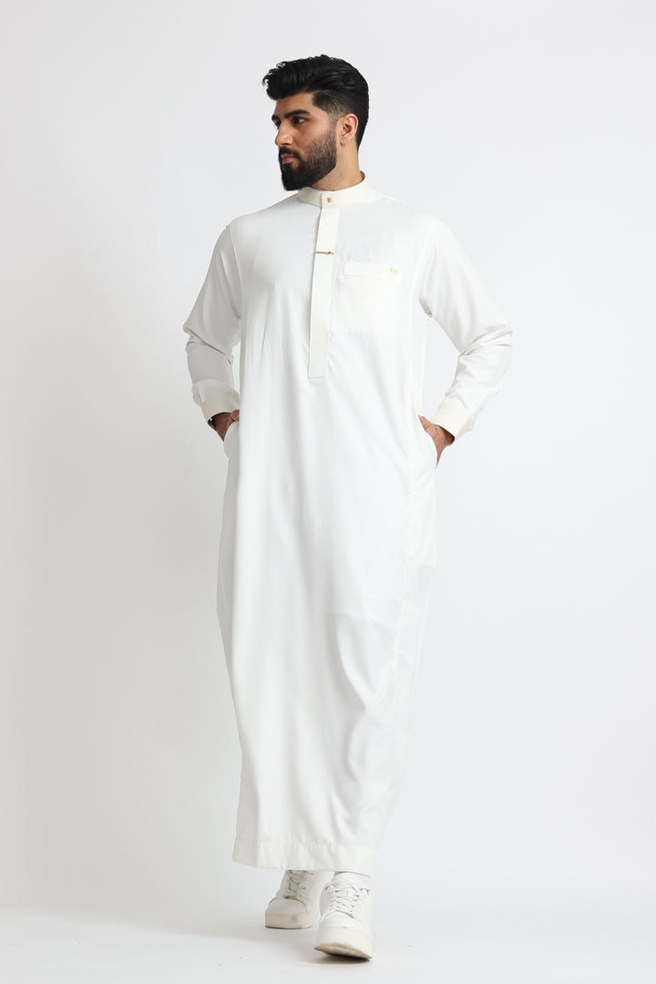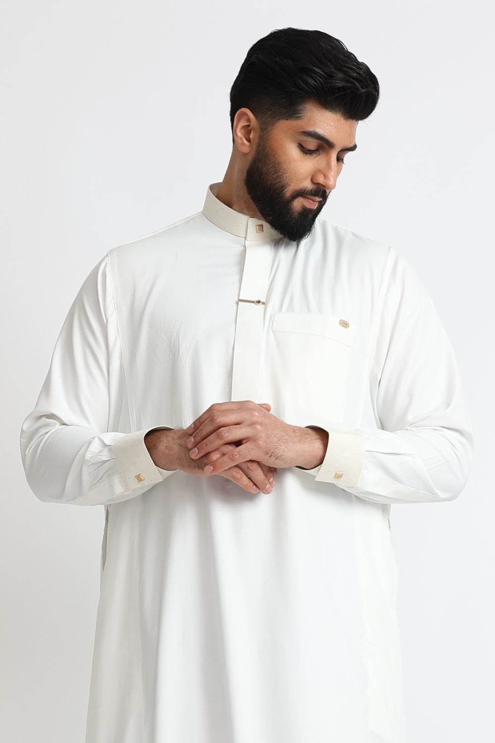 The gold tie clip on front adds an element of sophistication that will elevate any outfit. Whether you're attending a wedding or a formal dinner, this Super White Thobe is sure to make you stand out from the crowd.
