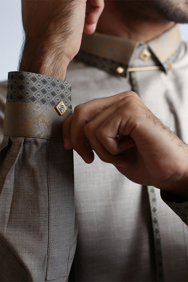 - The printed paisley fabric piping on the front, cuff and collar add a touch of sophistication to this traditional garment.