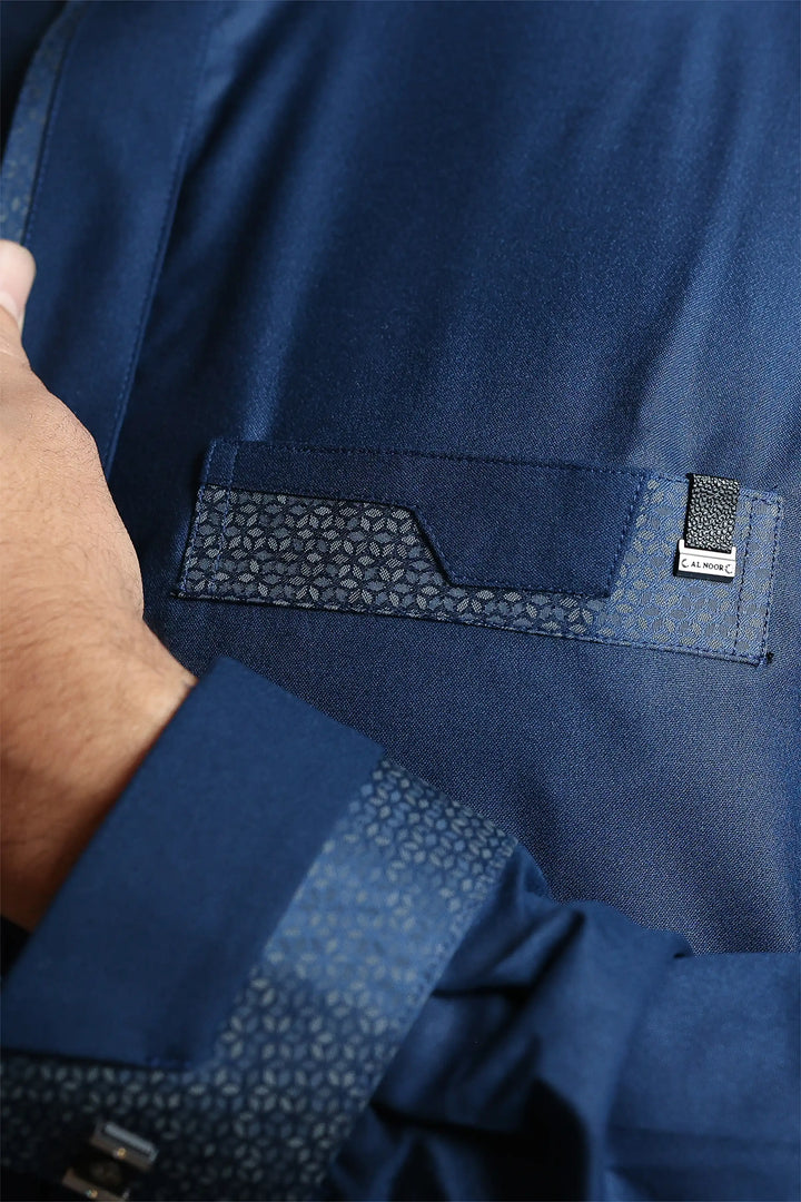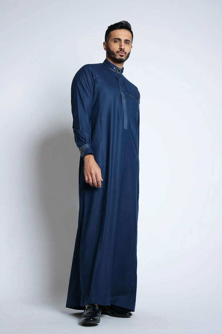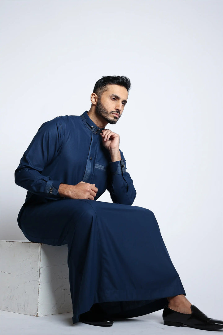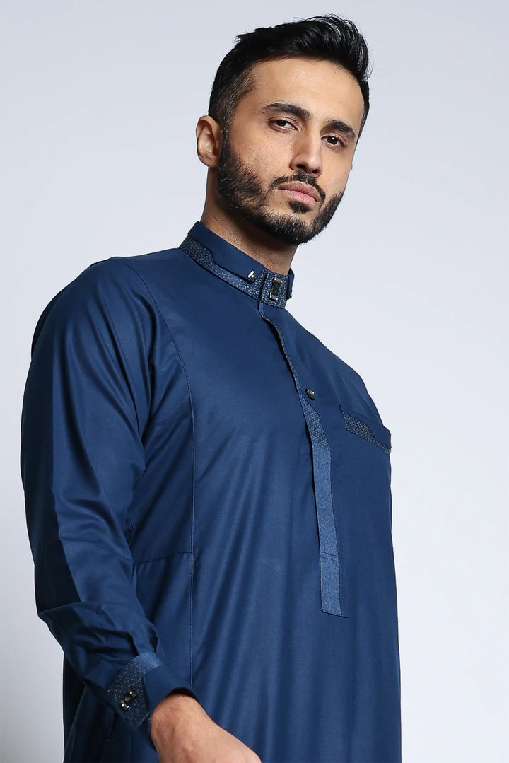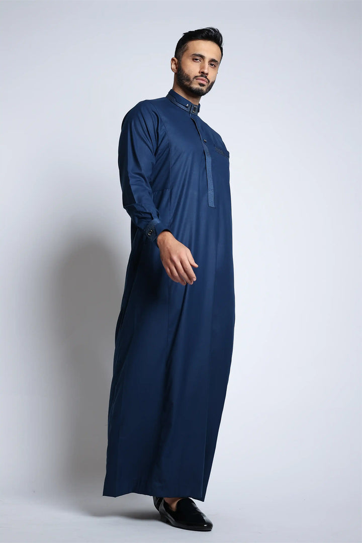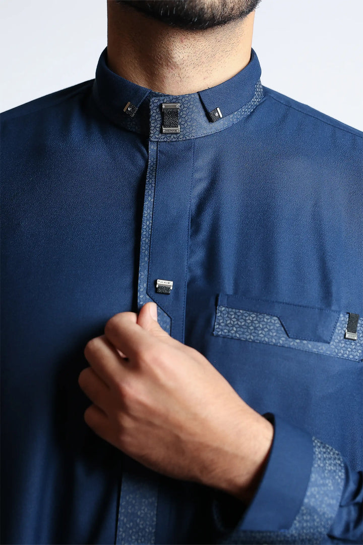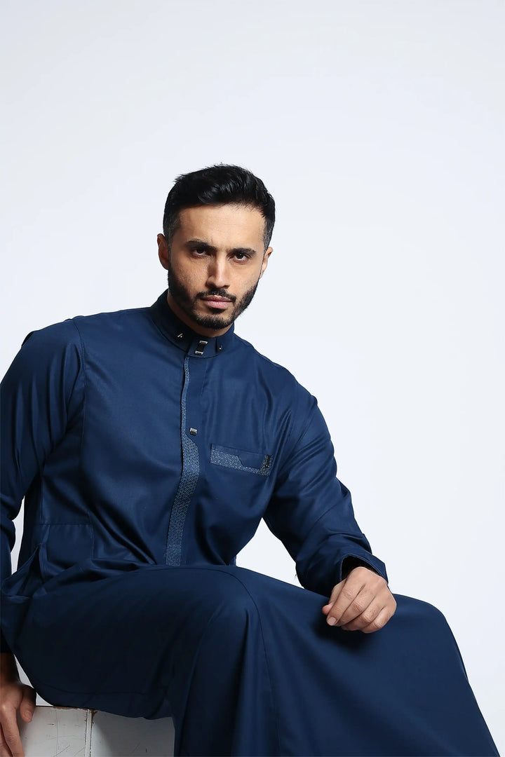 Step into timeless style with this premium Navy Blue thobe, crafted for sophistication and comfort. Featuring a folded collar subtly enhanced with a paisley print underlay, this thobe offers a refined touch of tradition with modern flair.