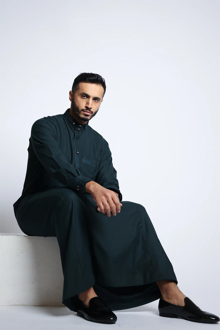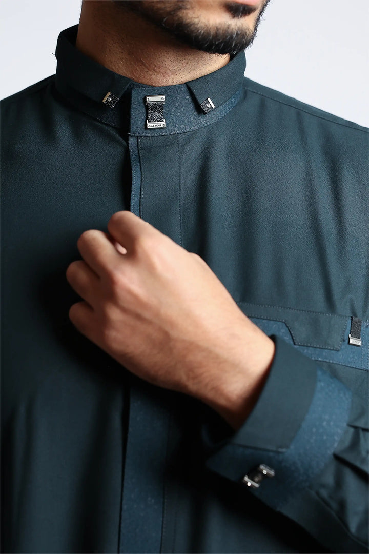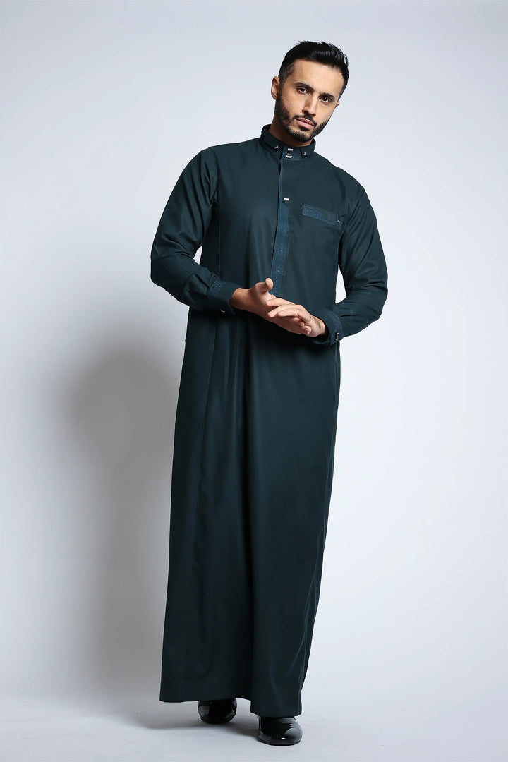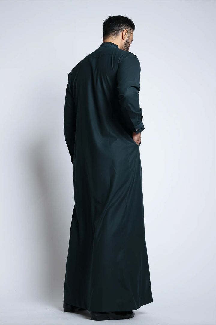 Step into timeless style with this premium Green Vouge thobe, crafted for sophistication and comfort. Featuring a folded collar subtly enhanced with a paisley print underlay, this thobe offers a refined touch of tradition with modern flair.