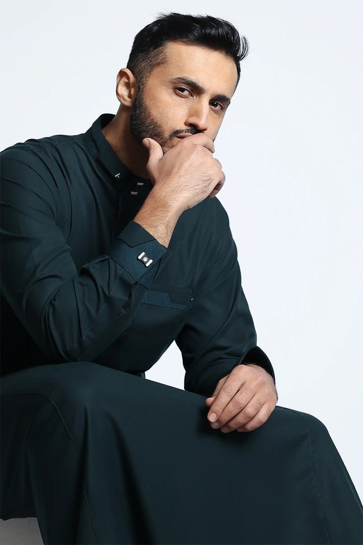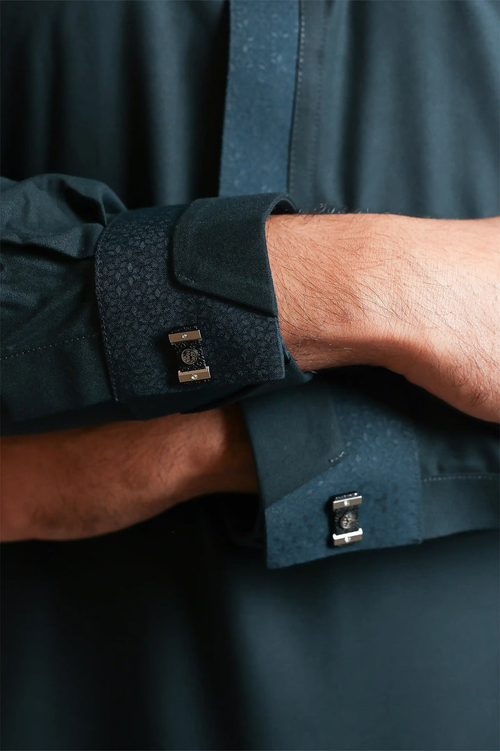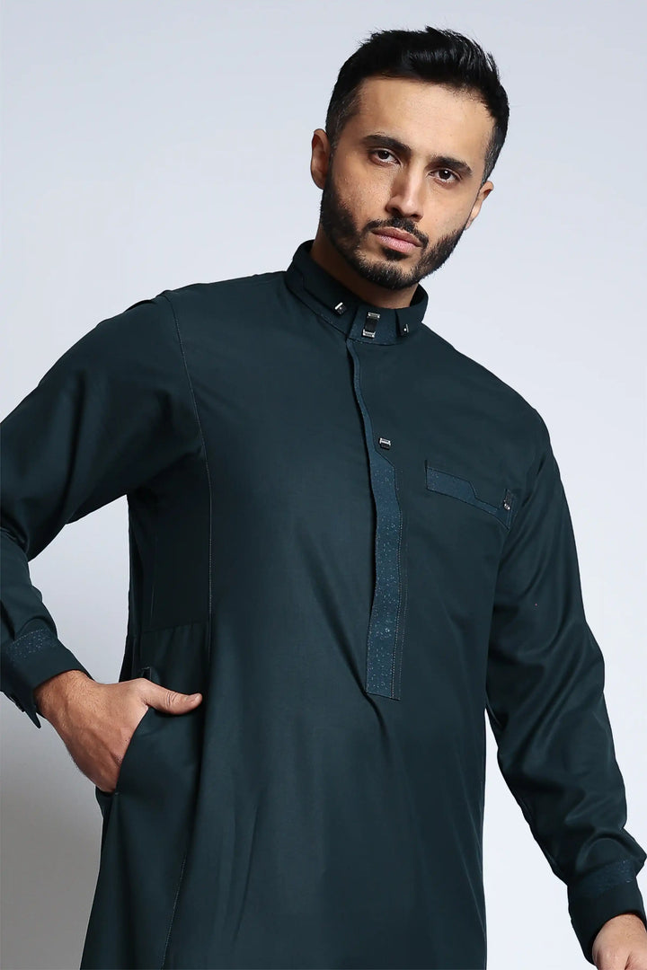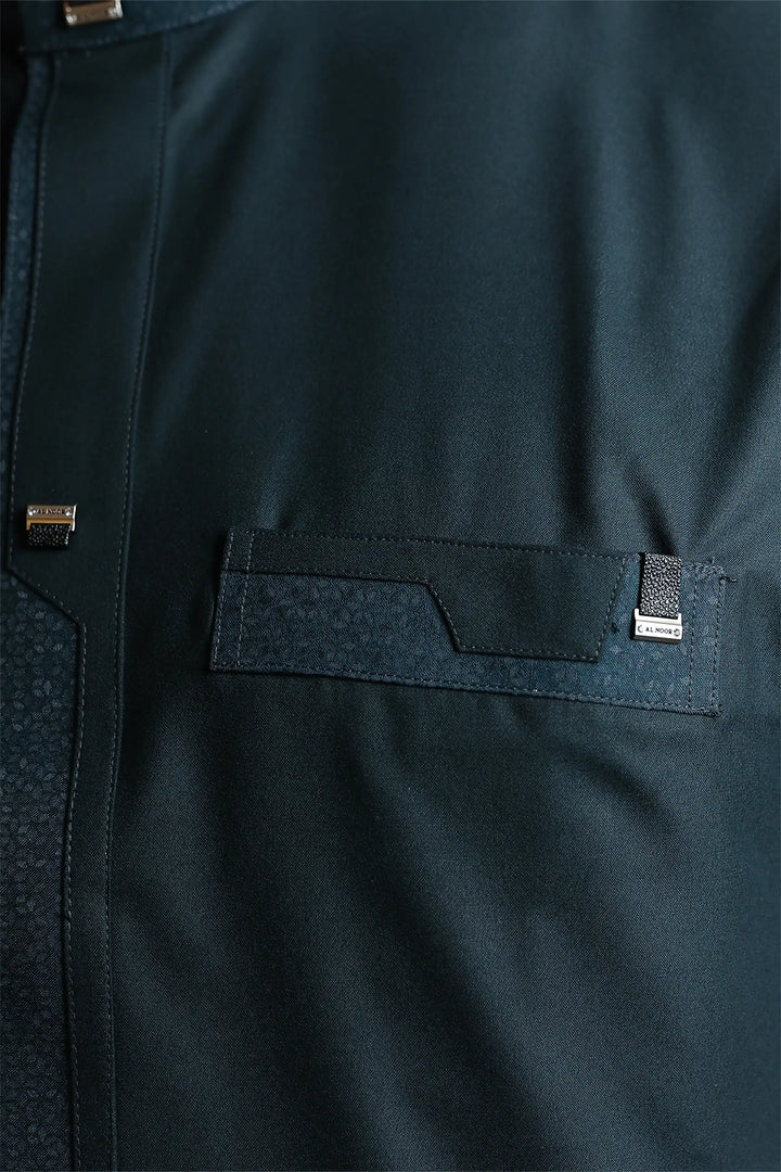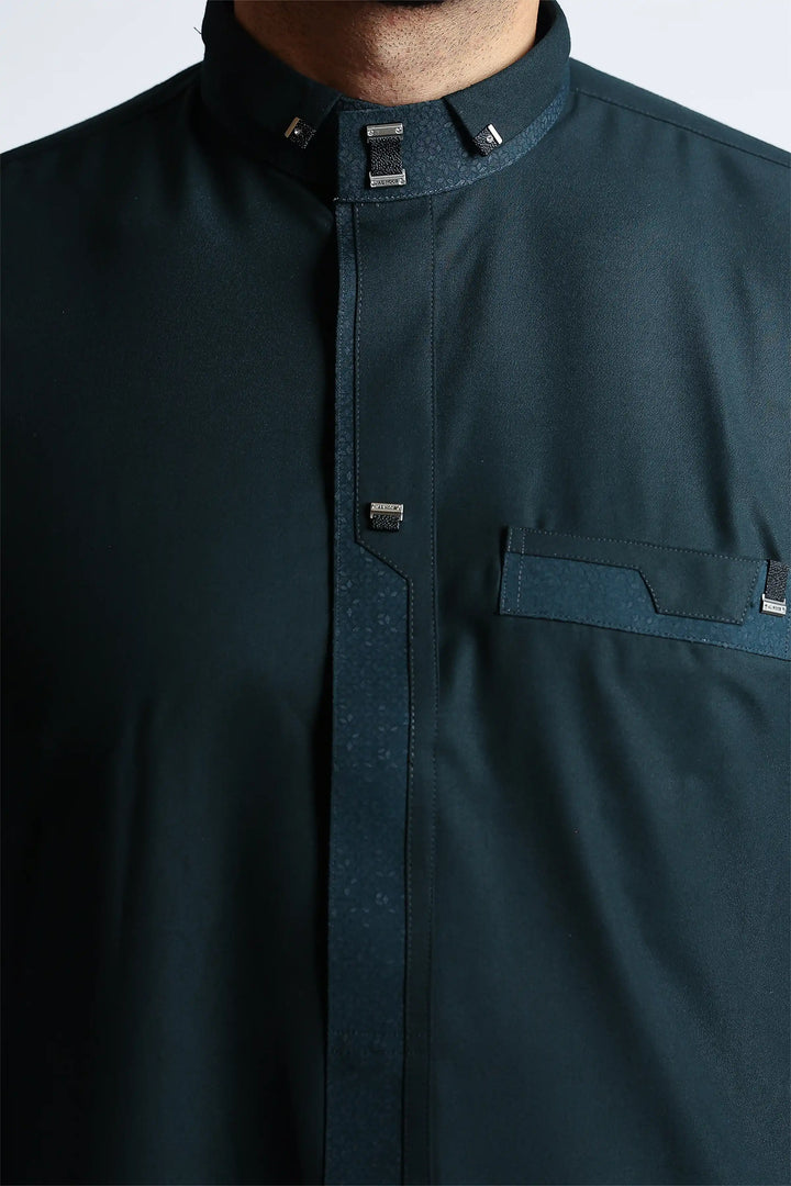 Step into timeless style with this premium Green Vouge thobe, crafted for sophistication and comfort. Featuring a folded collar subtly enhanced with a paisley print underlay, this thobe offers a refined touch of tradition with modern flair.
