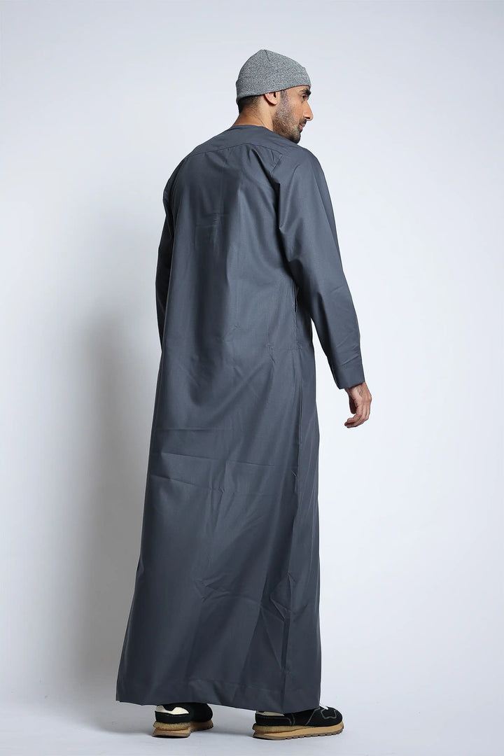 Experience timeless elegance with the Dusty Grey Piping Thobe from Al Noor. Designed in a classic Omani style (collarless jubba), this thobe features a sleek dusty grey piping trim for a refined touch. The single Al Noor calligraphy fashion-detailed button opening adds a unique element of sophistication.