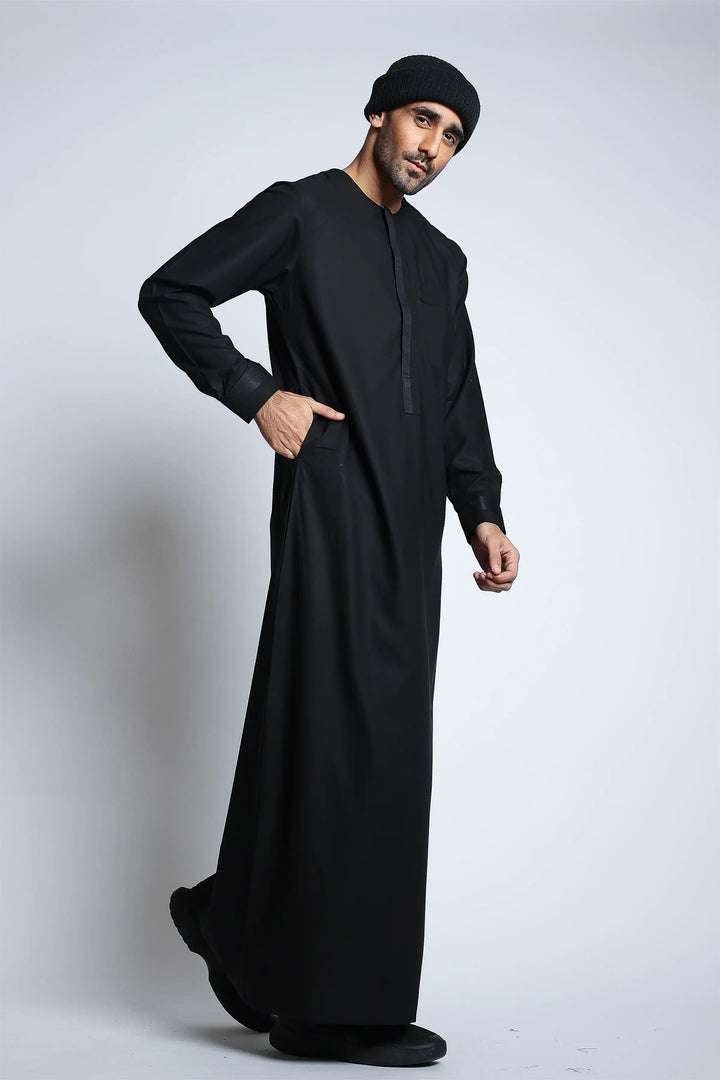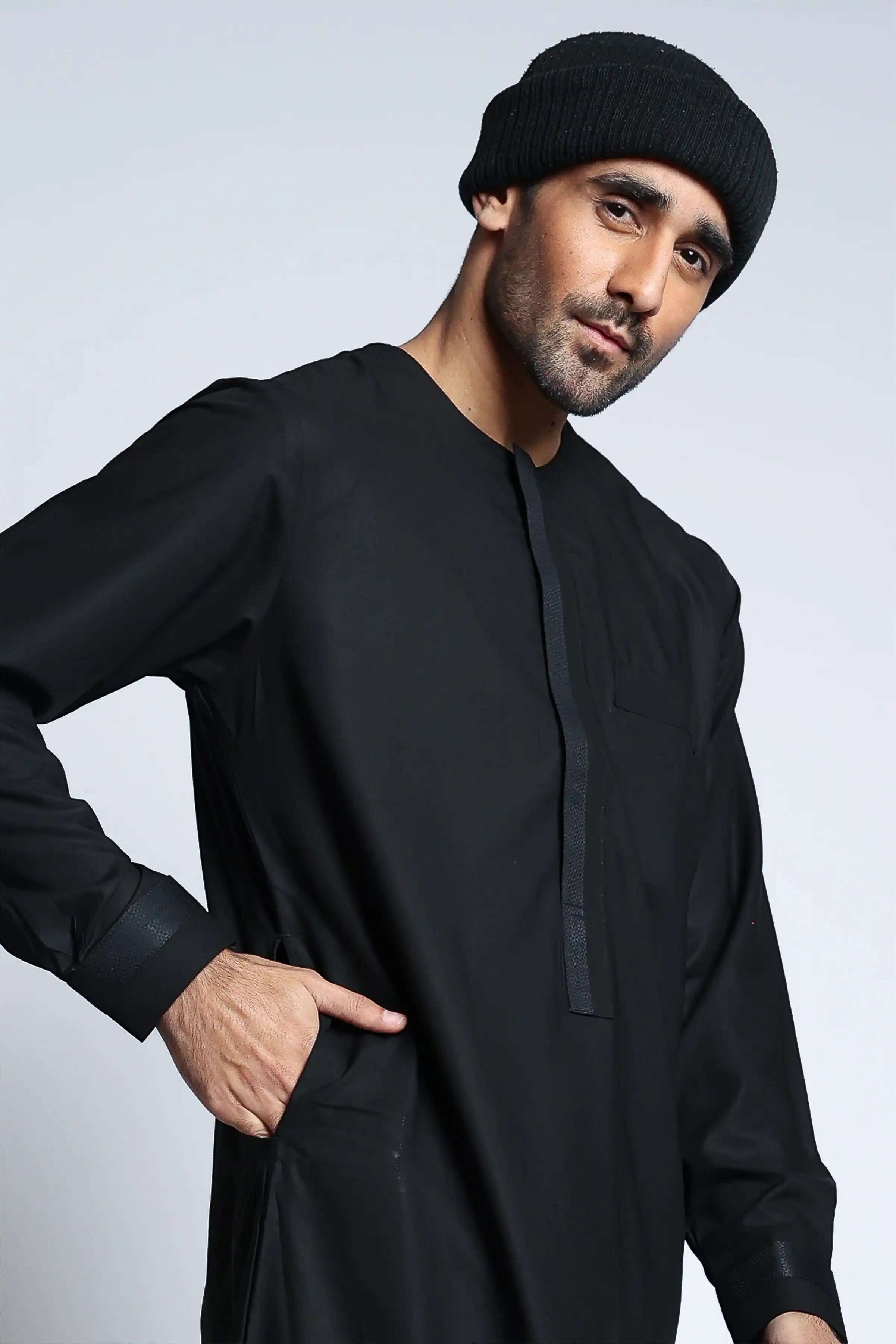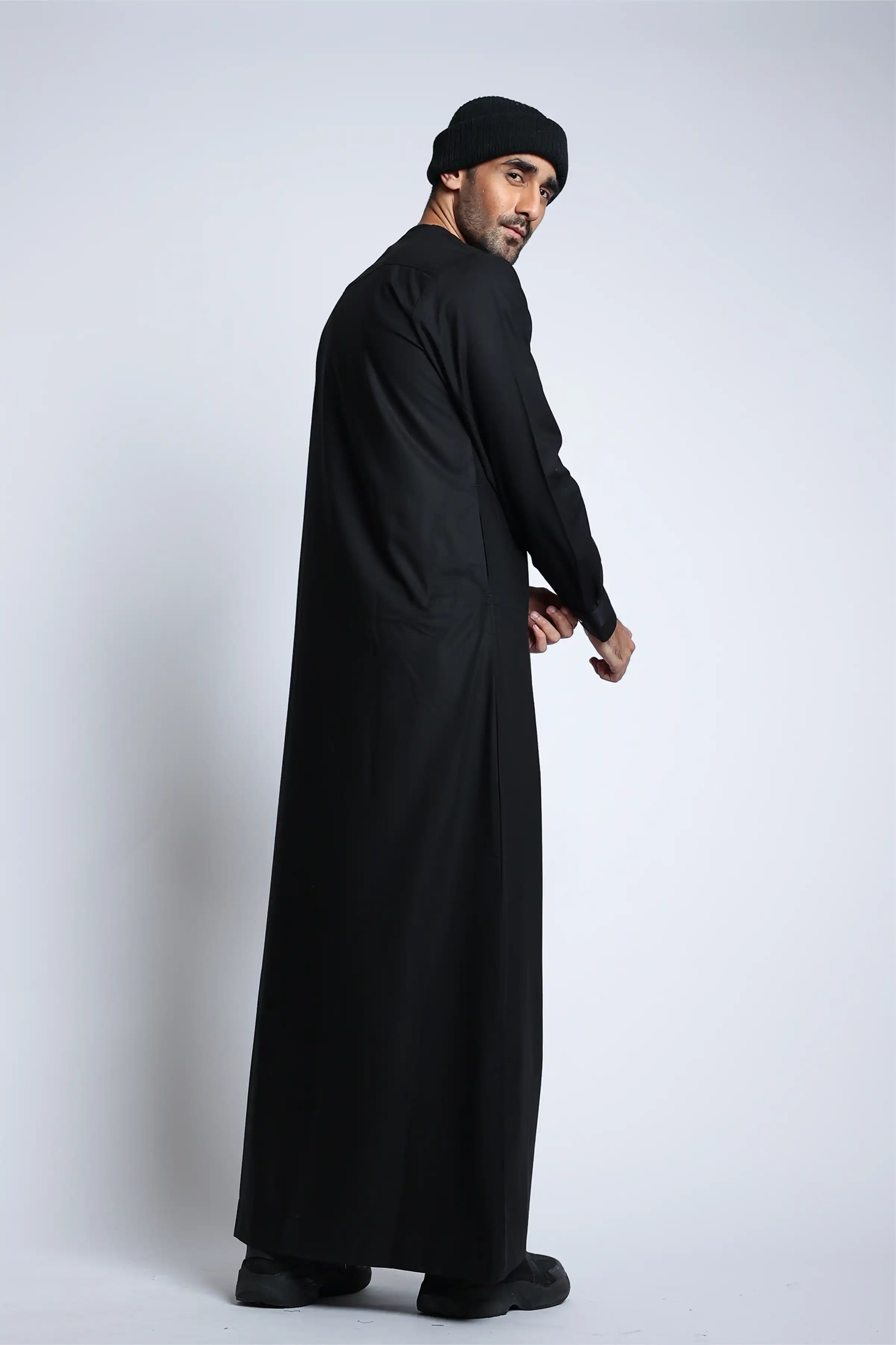 Elevate your wardrobe with the J149 Black Omani. Part of the Al Noor Collection, this thobe exudes style and elegance. The hidden zip opening and gold buttons on the cuff add a touch of sophistication. Made with soft polyester, it's both comfortable and chic.