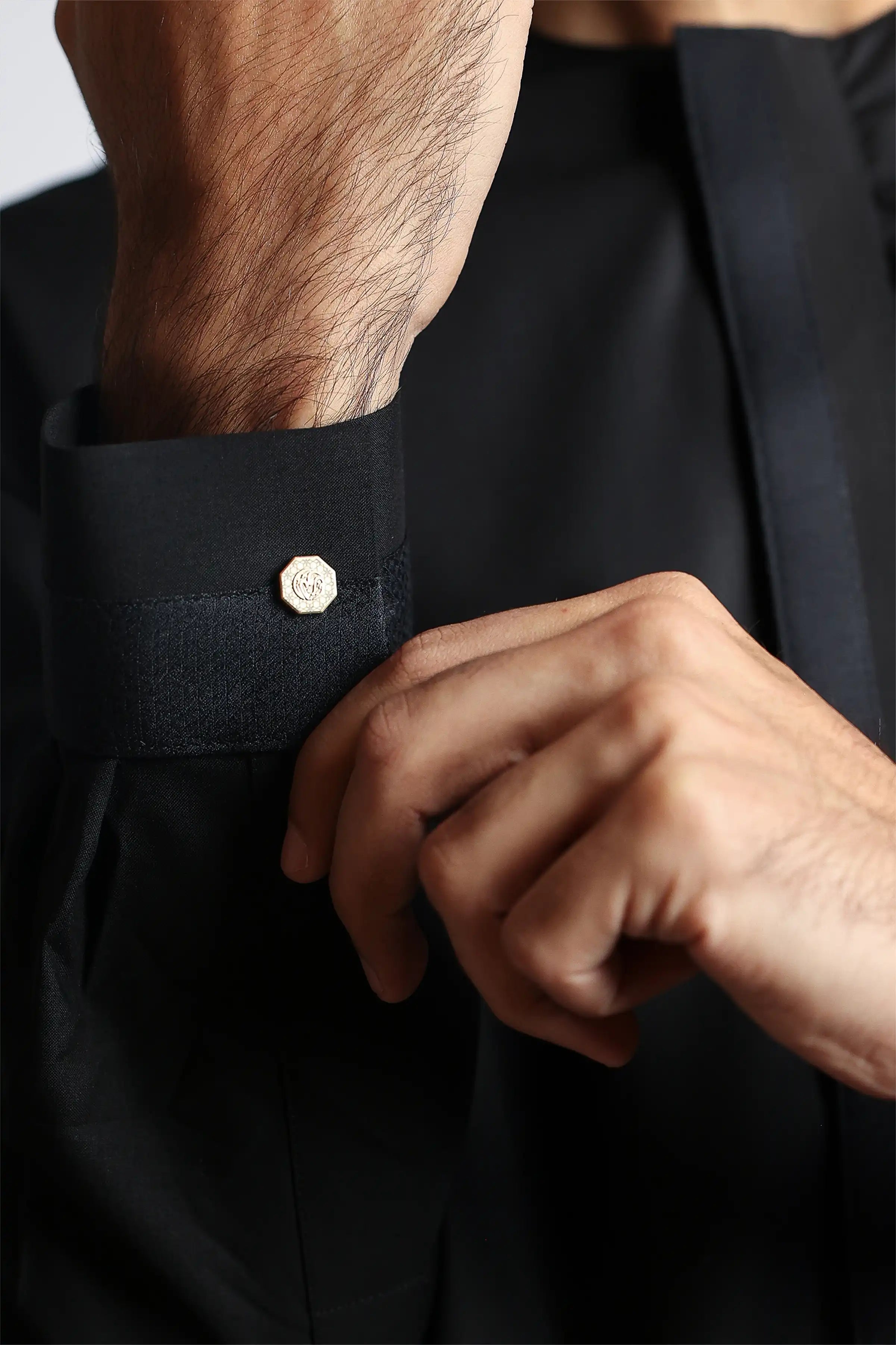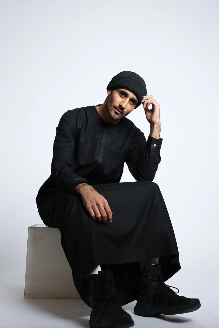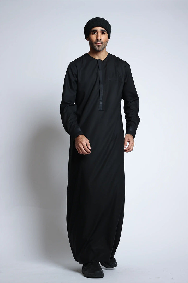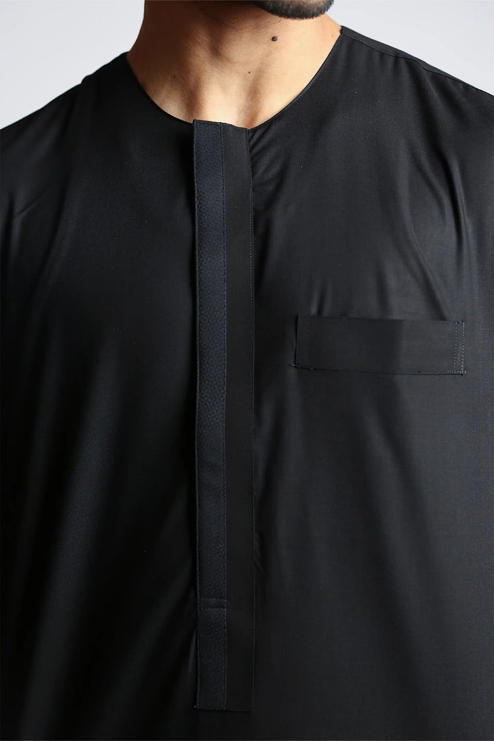 Elevate your wardrobe with the J149 Black Omani. Part of the Al Noor Collection, this thobe exudes style and elegance. The hidden zip opening and gold buttons on the cuff add a touch of sophistication. Made with soft polyester, it's both comfortable and chic.