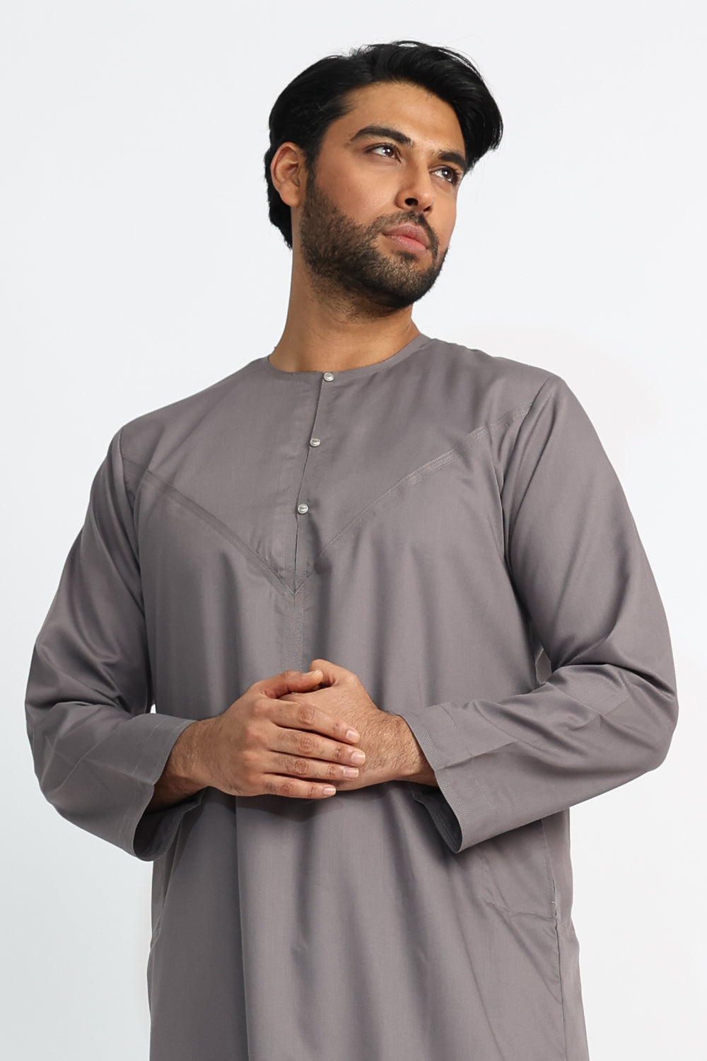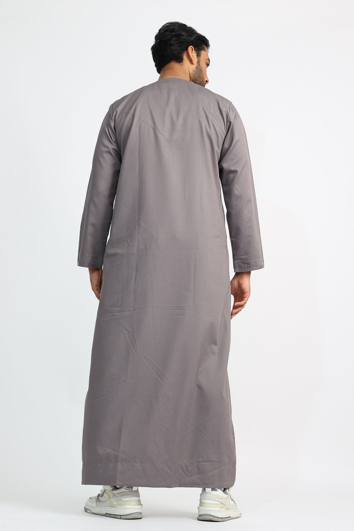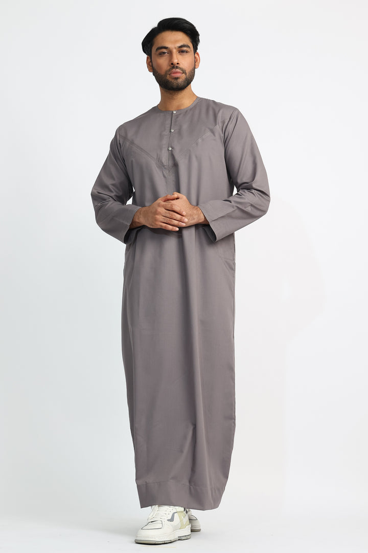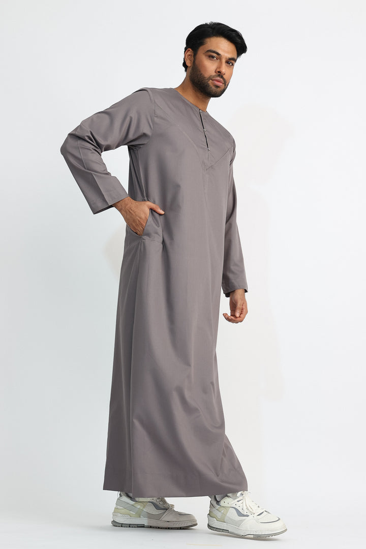 Experience the luxurious comfort and effortless style of our Mink Matt Omani. Crafted by Al Noor Thobe and soft matt fabric, this traditional thobe features a stylish press metal button opening, 2 side pockets for added convenience, and meticulous stitching. Elevate your wardrobe with this elegant piece.