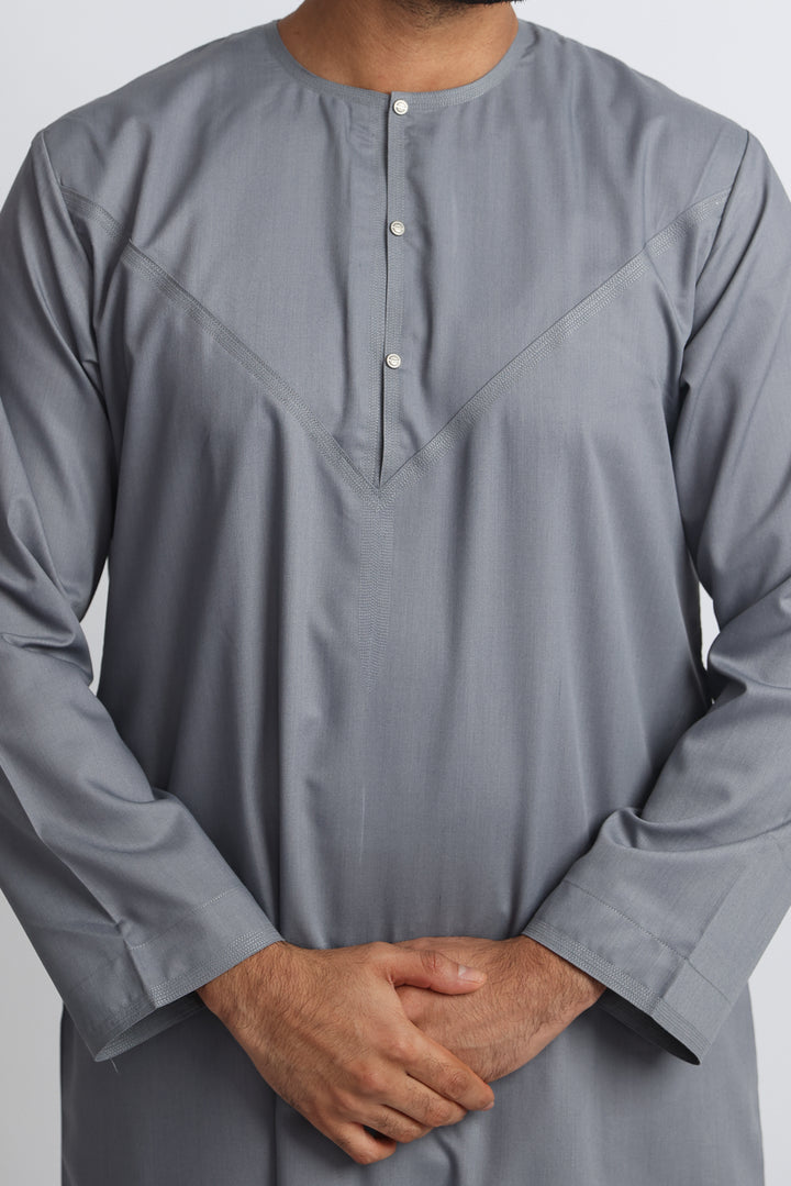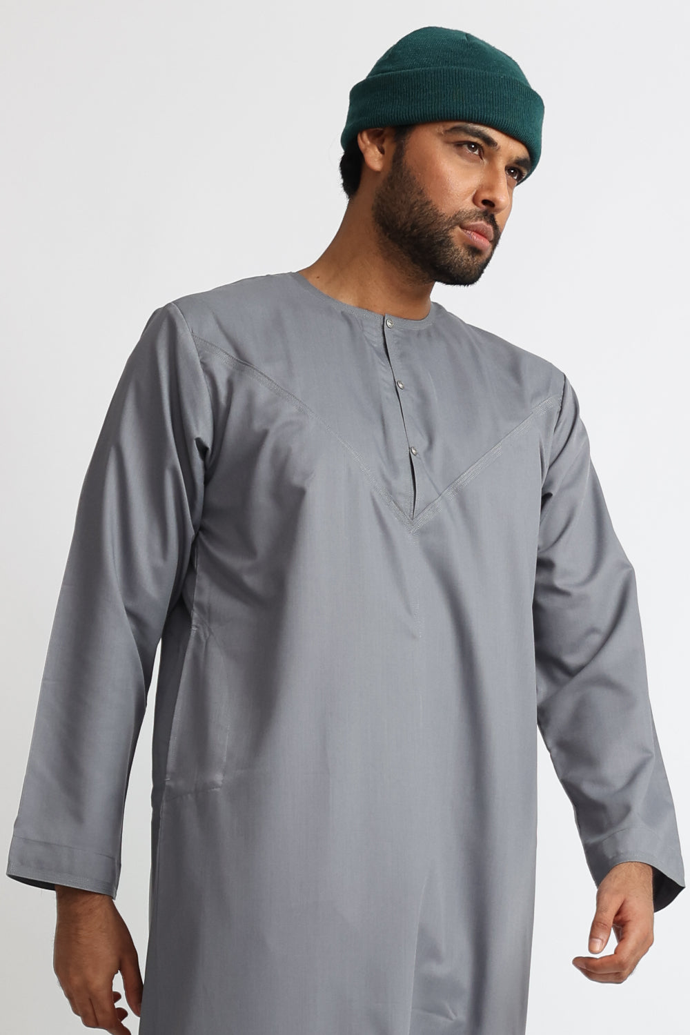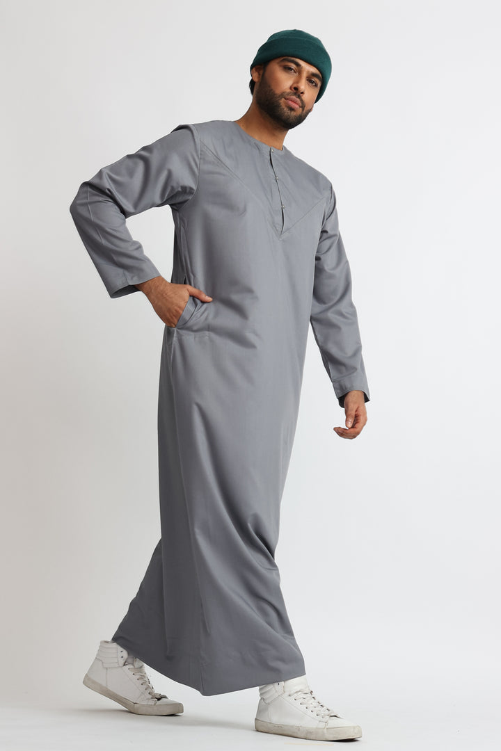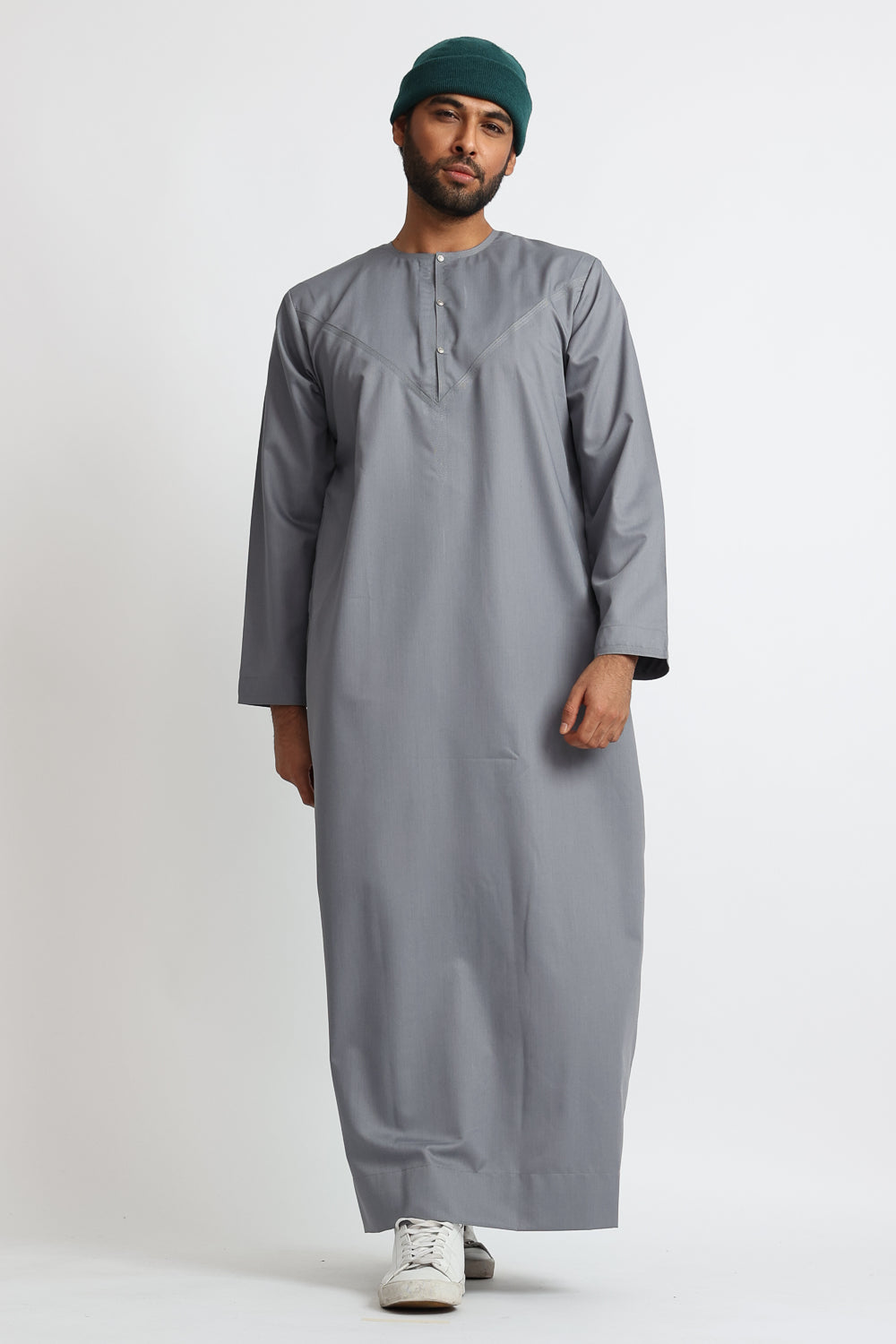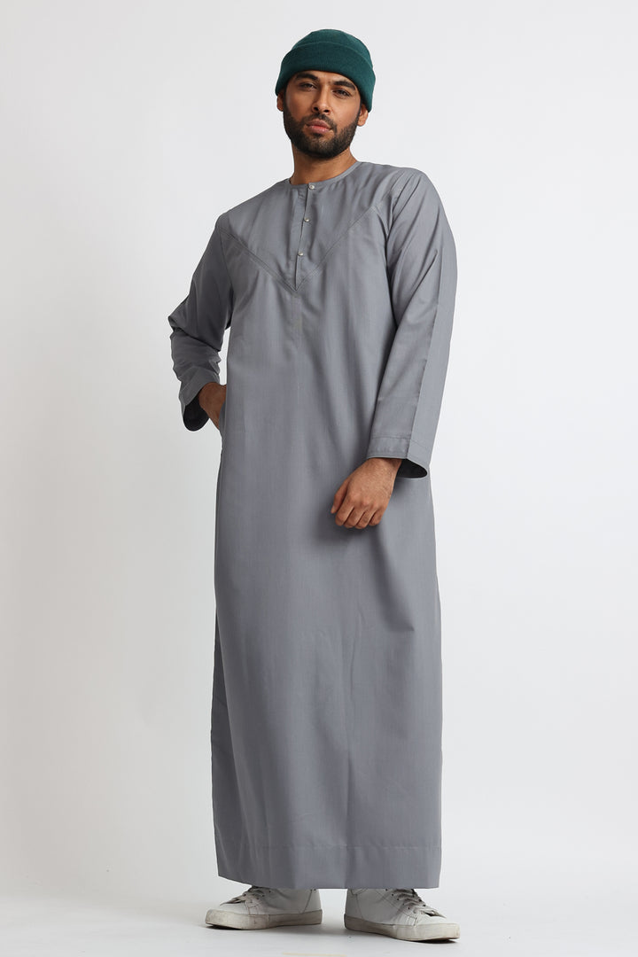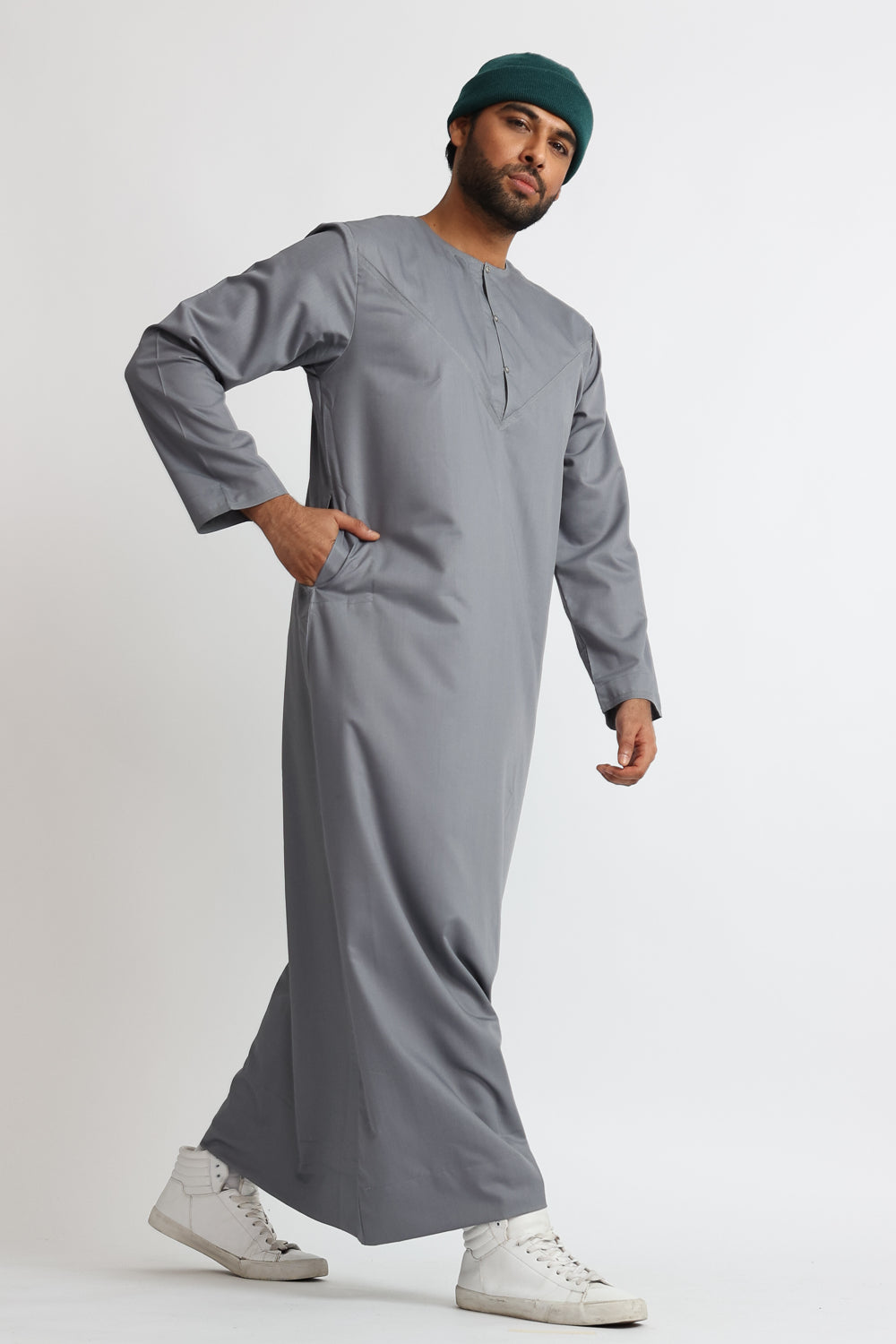 Experience the luxurious comfort and effortless style of our Natural Grey Omani. Crafted by Al Noor Thobe and soft matt fabric, this traditional thobe features a stylish press metal button opening, 2 side pockets for added convenience, and meticulous stitching. Elevate your wardrobe with this elegant piece.
