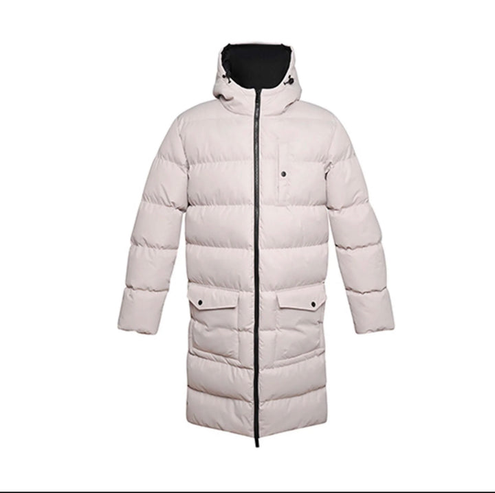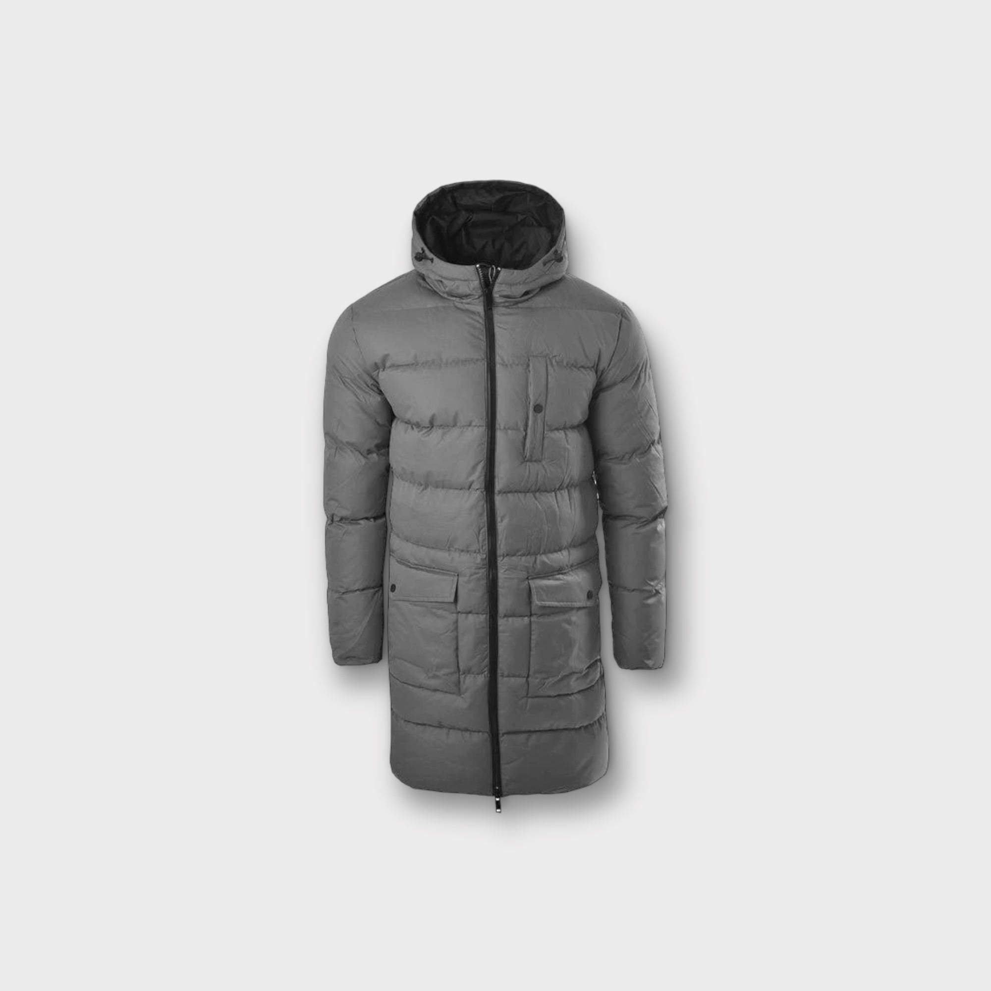 A quilted, longline puffer jacket with full zip fastening and adjustable hood. Two standard snap button pockets lie on the front of the jacket along with a left side chest pocket and an additional internal pocket.