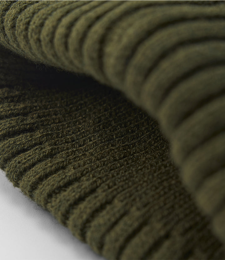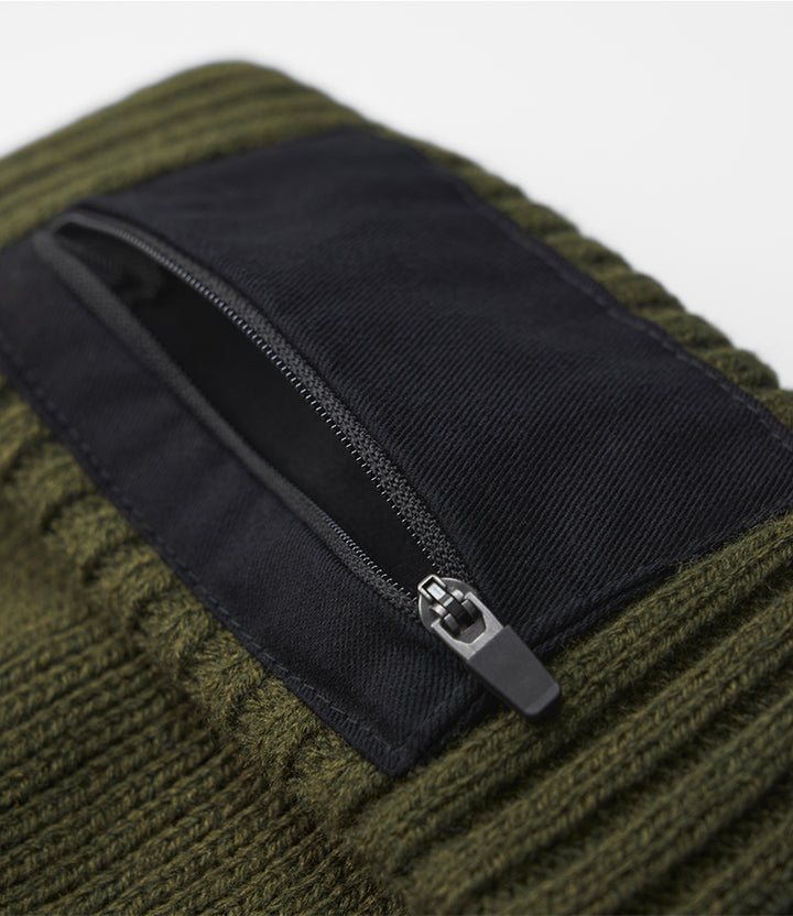 This Military Green/Black Zip Patch Beanie is crafted with a chunky double-layer knit for warmth and durability. It features a cuffed design and an engineered crown for a comfortable fit. The front includes a zippered patch pocket for convenient storage, complemented by a decorative cotton twill patch measuring 11 x 5 cm. Additionally, it has a tear-out label for easy removal.