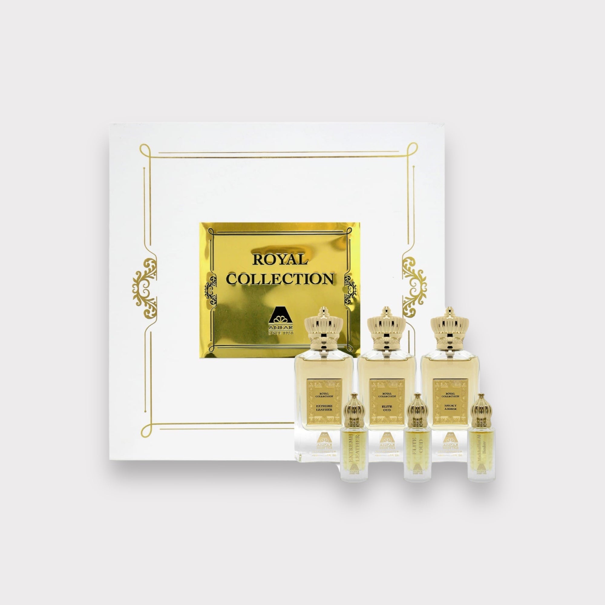 Discover the luxurious scent of the Royal Collection by Anfar Eau de Parfum gift set, featuring 50 ML bottles of Smokey Amber, Extreme Leather, and Elite Oud, plus accompanying 6ml oils. Experience a royal aroma, with a lingering scent to capture your senses