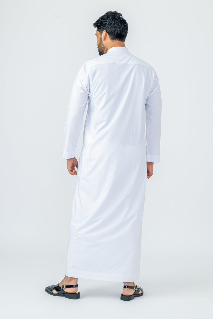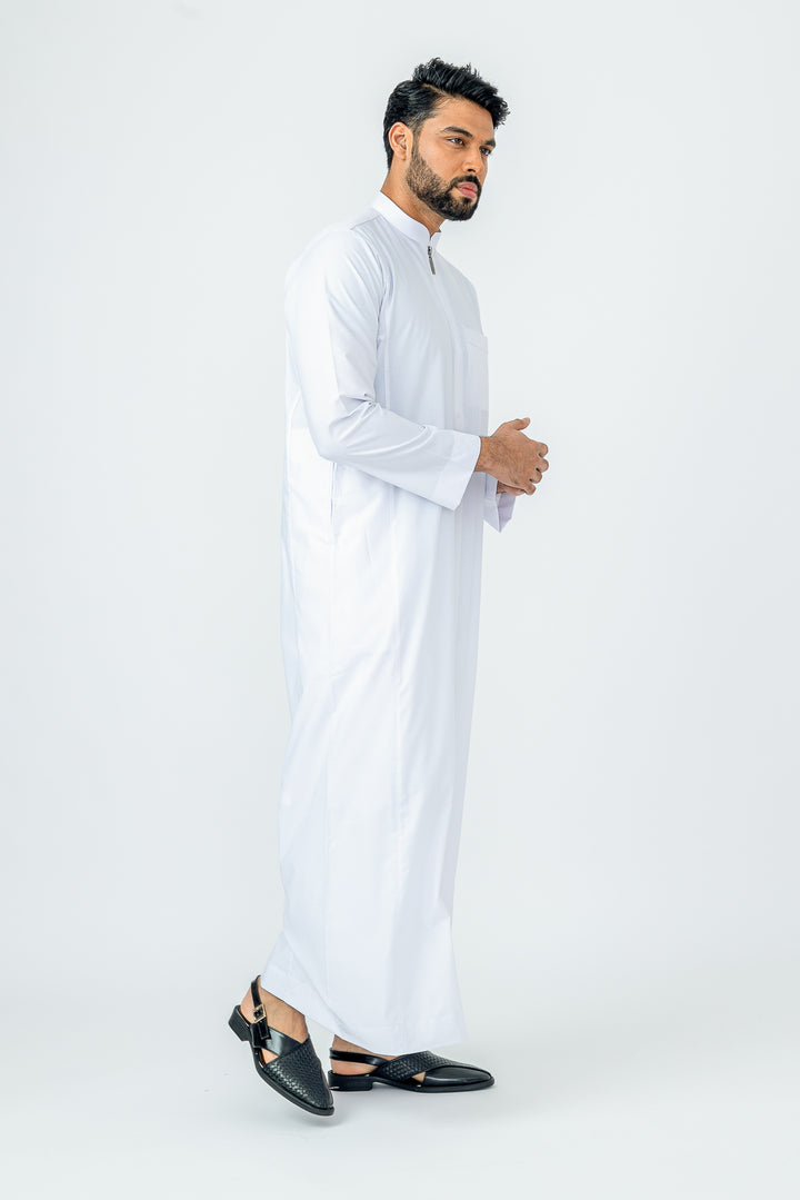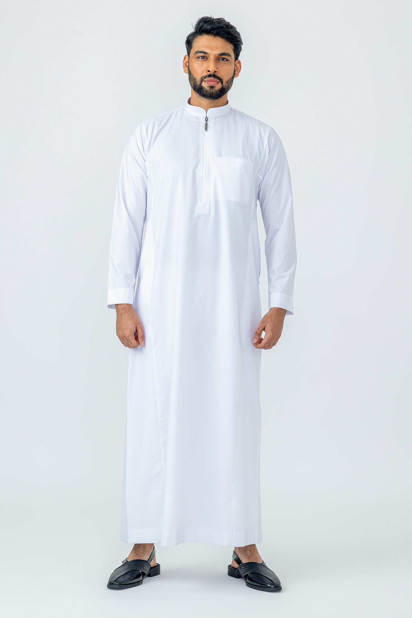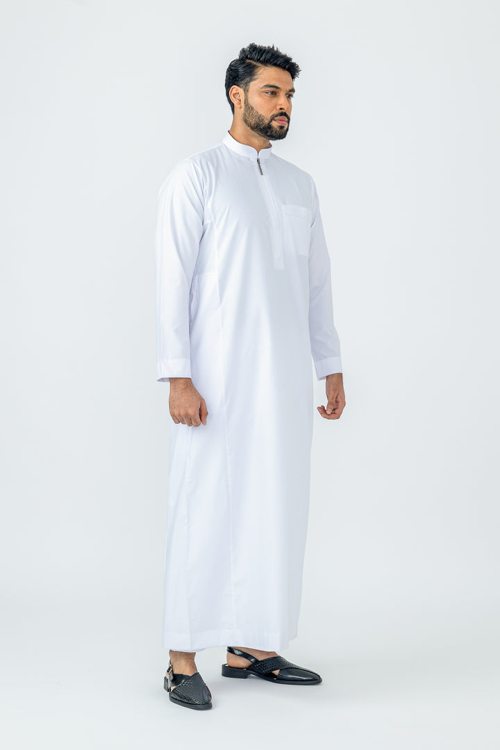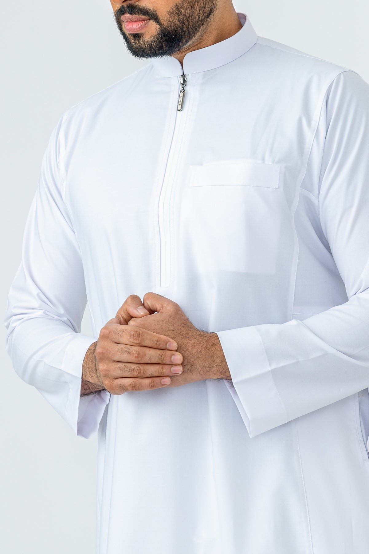 Look sophisticated and stylish in this classic White Plain Zip Collar. Crafted with soft polyester fabric and an invisible zipper opening, you'll experience comfort and style every day. The simple plain jubbah design oozes elegance and is perfect for any occasion. Make a statement with this timeless split collar thobe.
